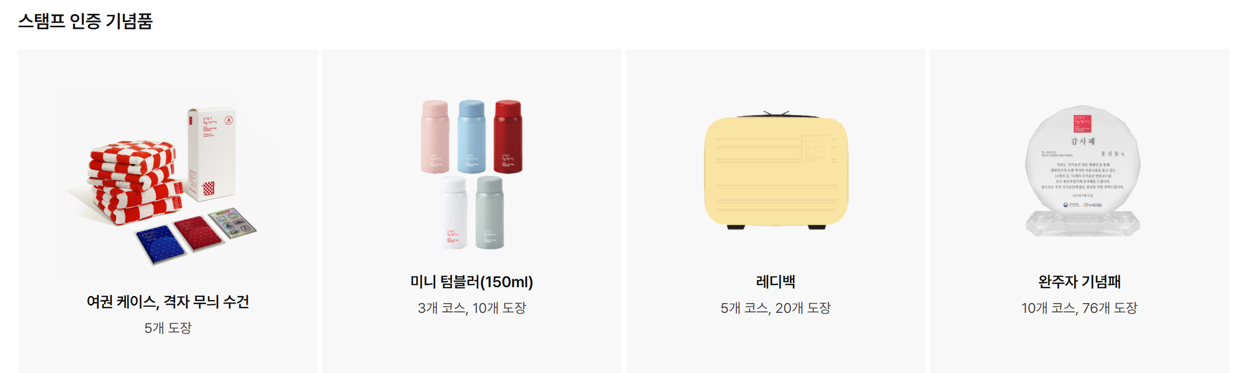 도장만 찍는 게 아니에요! 도장을 찍은 개수와 코스 수에 따라 기념품도 받을 수 있어요.